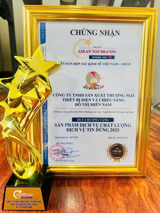 Cùng với giải thưởng trên, Công Ty Chiếu Sáng Đô Thị Miền Nam cũng đã vinh dự nhận Huy Chương Vàng Sản Phẩm Dịch Vụ Chất Lượng - Dịch Vụ Tin Dùng 2025. Danh hiệu cao quý này là lời khẳng định mạnh mẽ nhất về chất lượng sản phẩm và sự tin tưởng của khách hàng dành cho chúng tôi. Đây chính là động lực lớn để chúng tôi tiếp tục nỗ lực, mang đến những giải pháp chiếu sáng hiện đại, bền vững và chuyên nghiệp, đáp ứng mọi kỳ vọng của khách hàng.