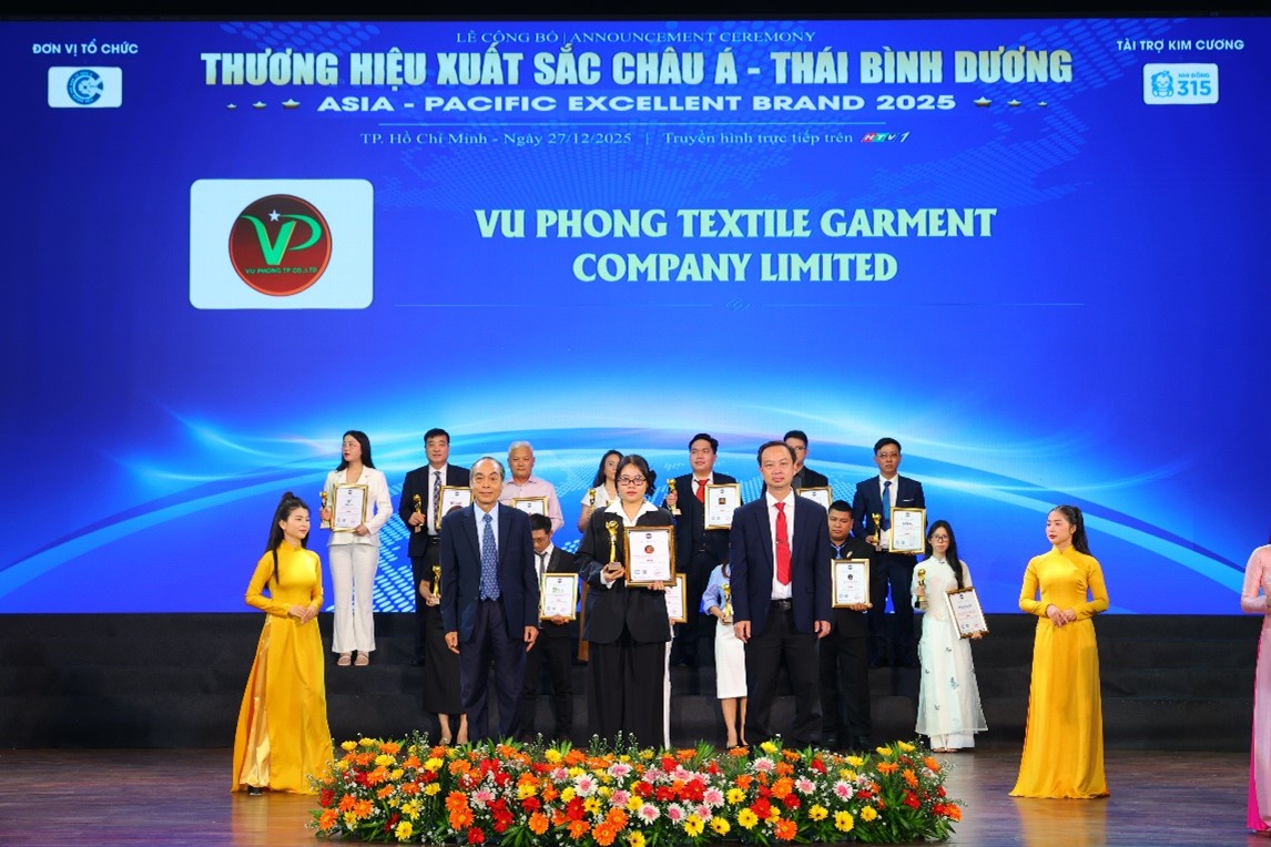 Vừa qua, tại Lễ vinh danh Thương hiệu xuất sắc Châu Á – Thái Bình Dương lần thứ XI, Công ty TNHH Dệt may Vũ Phong (Vu Phong Textile Garment Company Limited) đã vượt qua hàng loạt tiêu chí khắt khe để chính thức ghi tên mình vào "Top 10 Thương hiệu xuất sắc Châu Á - Thái Bình Dương". Đây là dấu son chói lọi, khẳng định vị thế dẫn đầu của một doanh nghiệp Việt trong ngành dệt may trên bản đồ khu vực.