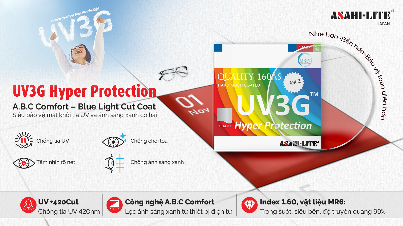 Vừa qua, ATB Company chính thức giới thiệu sản phẩm tròng kính chống ánh sáng xanh Asahi UV3G Hyper Protection hoàn toàn mới với công nghệ độc quyền A.B.C Comfort giúp giảm tới 30% ánh sáng xanh năng lượng cao (HEV), kết hợp công nghệ UV+420cut giúp chặn 100% tia UV gây hại, mang lại trải nghiệm thị giác dễ chịu, ngăn ngừa đục thủy tinh thể, thoái hóa điểm vàng và bảo vệ mắt hiệu quả trong mọi điều kiện ánh sáng.