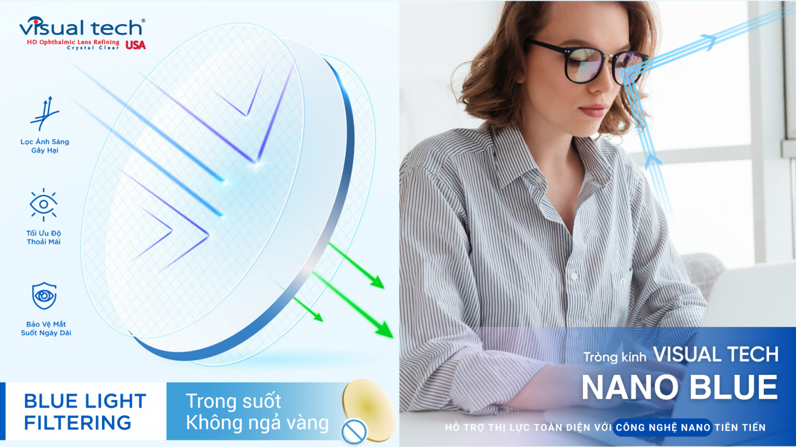 Tròng kính chống ánh sáng xanh Nano Blue thế hệ mới với công nghệ nano tiên tiến, mang đến khả năng lọc ánh sáng xanh vượt trội;